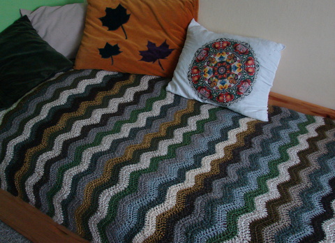 Z ogromną dumą prezentuję efekt trzymiesięcznego szydełkowania - pled w jesiennych kolorach o wzorze falistym jak pagórki ukochanego Beskidu Niskiego. Dumna jestem z trzech powodów - po pierwsze: opanowałam nowy wzór;  po drugie: dotrwałam do końca, co przy rozmiarach mojej kanapy (220x100cm) wcale nie było łatwe, w zamyśle miał też służyć jako narzuta na zmianę; a po trzecie: udało mi się go skończyć dokładnie pierwszego dnia jesieni!